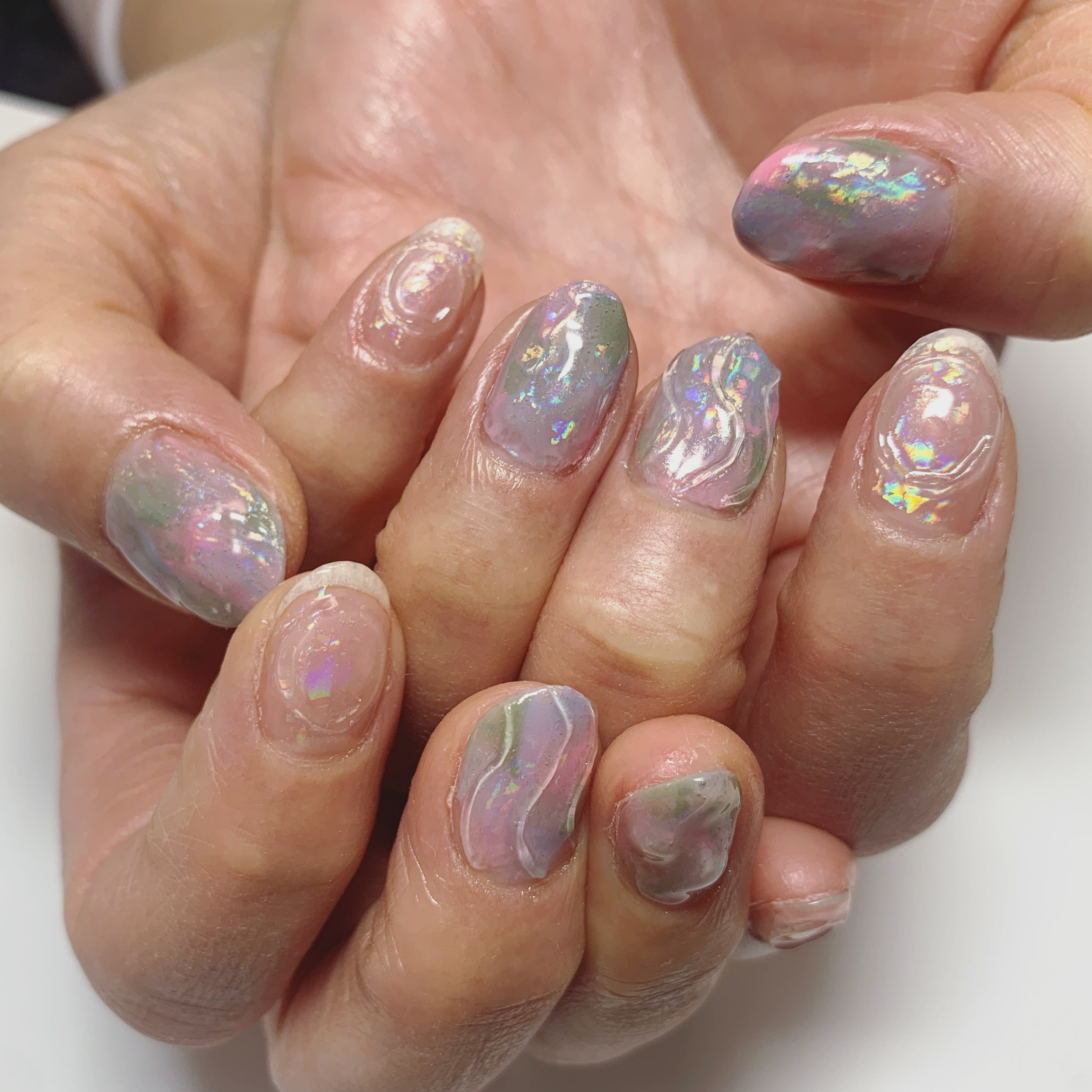 この春話題のオーロラネイル。 洞窟の中の不思議な光を放つ石のような仕上がりです。 クリアアートは涼しげで、これからの時期におすすめですよ。