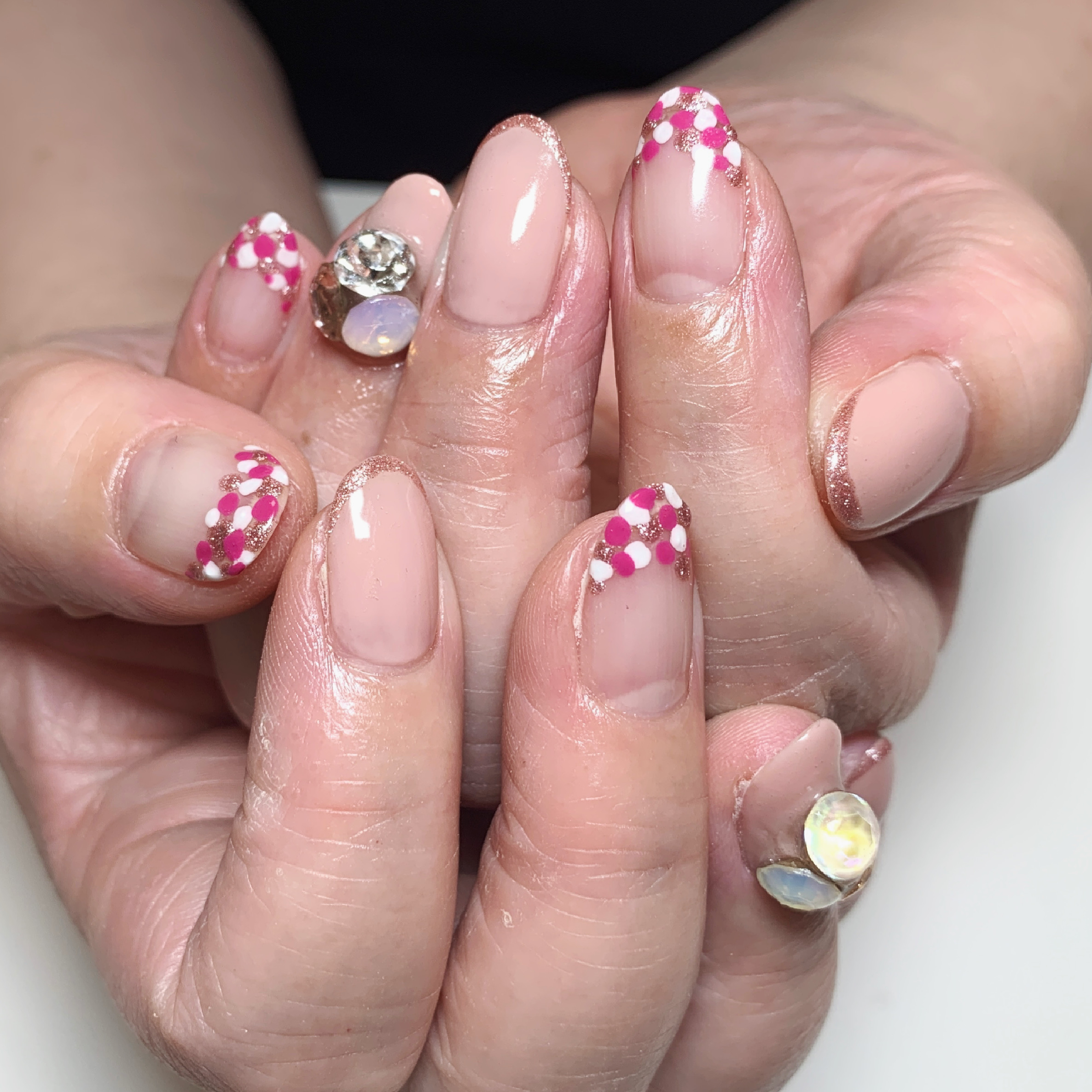 ドットで埋め尽くしたフレンチネイルがポップでかわいいです。 他の爪は極細ラメフレンチで、これまたかわいいのです。