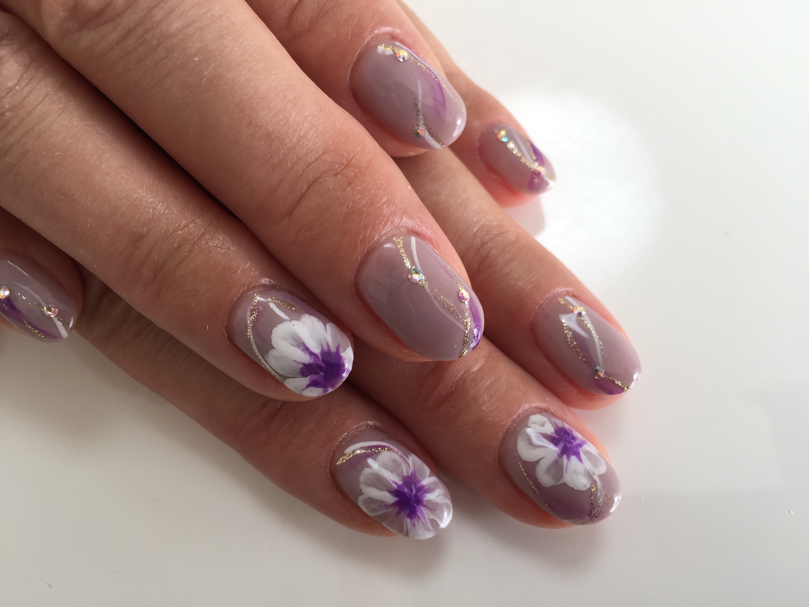 人気のフラワーアートをパープル系でまとめました! くすみカラーのベースにして、落ち着いた印象に! 和風な仕上がりです!