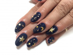 サンプルを参考に少しアレンジしたデザインです★ サロンの雰囲気に合わせた星と月のモチーフ★ ネイビーベースで冬の夜空のイメージです!